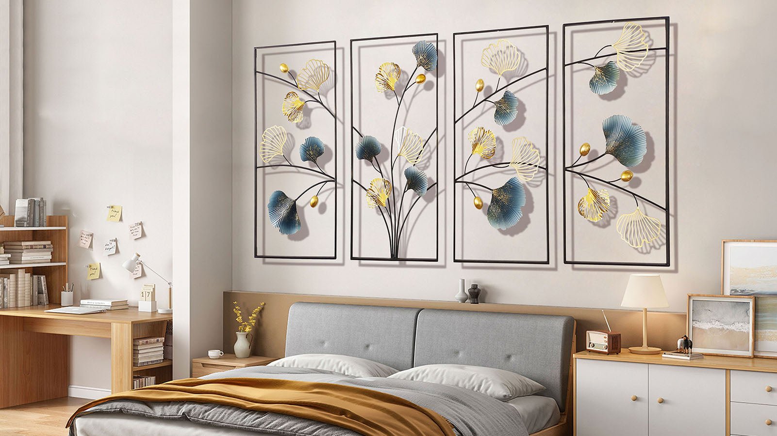 Creative 4 Panels Metal Ginkgo Leaf Wall Art Decor, Luxury 3D Handmade Metal Wall Hanging Sculpture, Natural Home Art Decoration