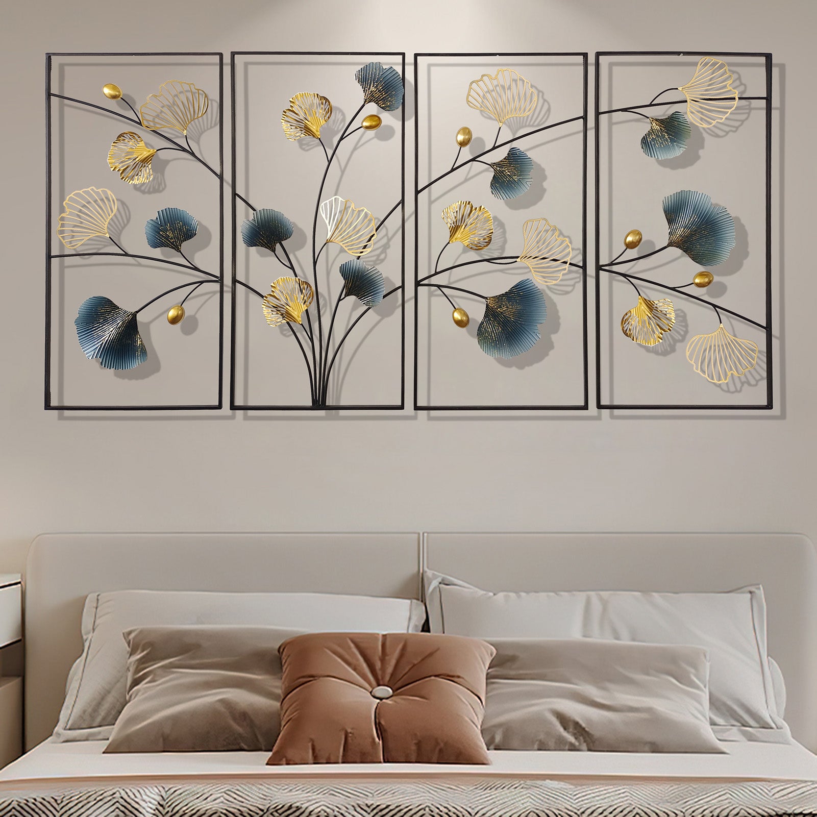 Creative 4 Panels Metal Ginkgo Leaf Wall Art Decor, Luxury 3D Handmade Metal Wall Hanging Sculpture, Natural Home Art Decoration